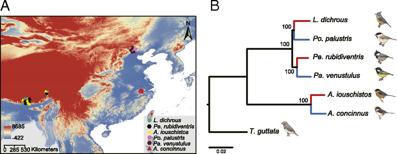 高海拔环境的选择压力会驱动生物体表型和遗传的适应。研究组早期的研究表明不同高海拔物种在形态、生理、生化等表型特征出现趋同(Zhu et al. 2018. PNAS),而这种趋同表型的遗传适应机制是多样的,可能受到系统发育背景的严重影响。同时,由于野生鸟类采样困难且转录组测序样品质量要求较高,早期高海拔适应遗传机制的研究多集中在基因序列水平,而以多物种多组织转录调控水平的研究几乎空白(Hao et al. 2019. Current Genomics)。 研究组在同一个系统发育背景下,选择3种来自青藏高原的高海拔雀形目鸟类[褐冠山雀(Lophophanes dichrous)、黑冠山雀(Periparus rubidiventris)、棕额长尾山雀(Aegithalos iouschistos)]和其各自近缘的低海拔物种[沼泽山雀(Poecile palustris)、黄腹山雀(Pardaliparus venustulus)、红头长尾山雀(A. concinnus)]进行了比较转录组学分析。