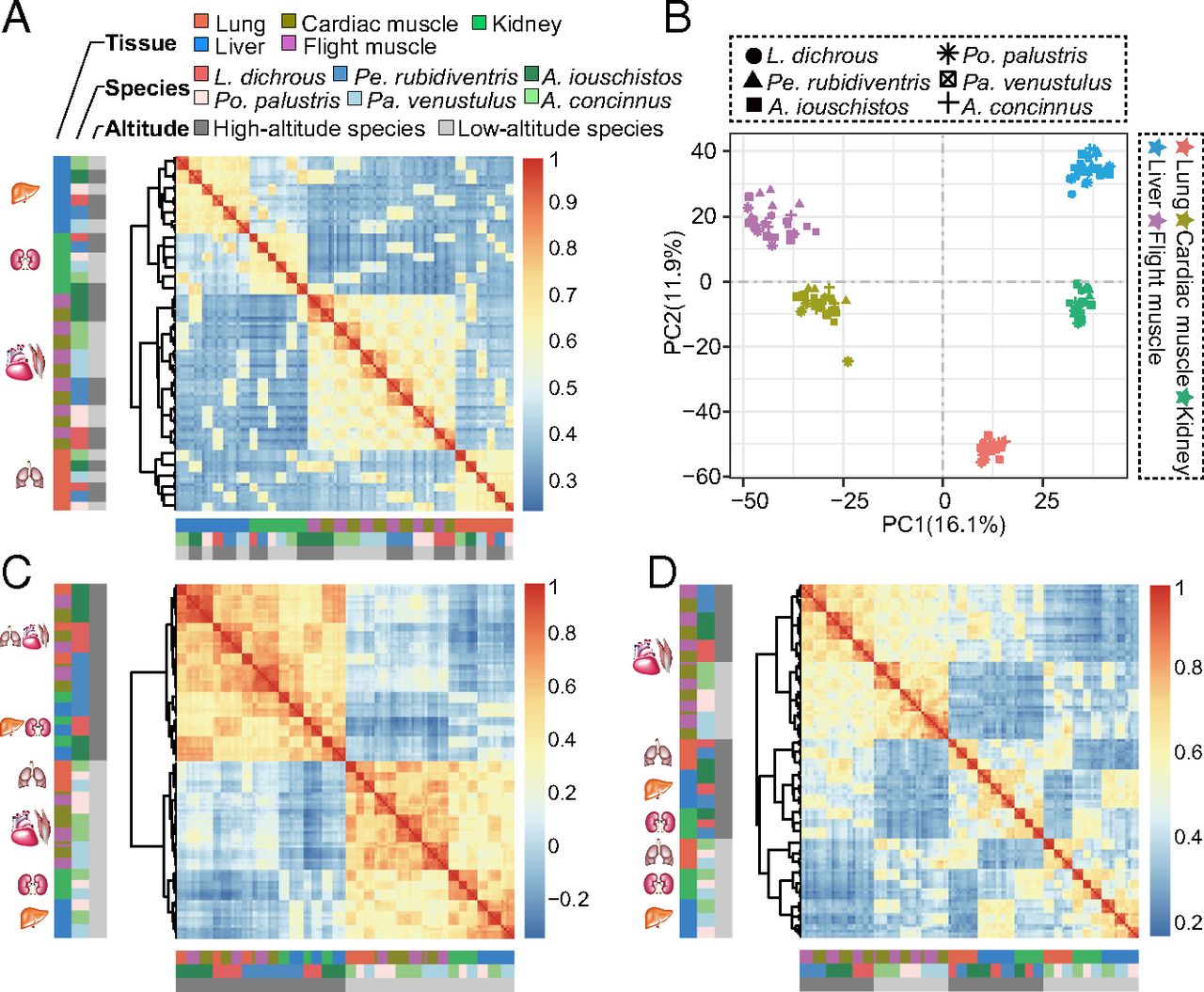 图1.(A)样品采集地 (B)物种系统发育关系 该研究应用第二代高通量测序技术完成了3对高、低海拔物种28个个体5个组织(心脏、肌肉、肝脏、肺脏、肾脏)共128个样品的深度转录组测序,并比较了高、低海拔物种之间在序列水平和表达水平的差异,从而揭示鸟类如何响应高海拔的环境压力。序列比较分析发现:3种高海拔物种在正选择基因上表现出高度相似性(218个共享的正选择基因),而氨基酸替代上的相似性极低(3种高海拔物种只有4个基因中包含相同的氨基酸替代位点),暗示了高海拔适应性趋同主要表现在正选择基因水平而非氨基酸替代水平。基因表达比较分析发现:整个基因集的表达谱呈现出组织特异的表达模式(所有物种样品按照组织聚类);而差异表达基因集和海拔相关的基因集的表达谱则呈现出海拔相关的聚类模式,暗示了高海拔环境可能驱动了高海拔物种相似的表达改变。此外,还发现3种高海拔物种筛选到的正选择基因与差异表达基因存在非常低的共享率(2.3%,218个正选择基因中5个基因差异表达),而基因表达、基因连通性及二者和海拔的交互作用与基因的进化速率显著相关。这些结果揭示了3种高海拔鸟类可能以序列和表达水平协同改变的方式实现其适应性进化。 图2.(A)整个基因集表达谱 (B)整个基因集PCA (C)差异表达基因集表达谱 (D)海拔相关的基因集表达谱