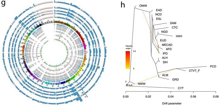 该团队首先开发了首个传染性肿瘤专用的基因型检测工具ttgeno,利用ttgeno获得了每例CTVT全基因组所有位点的基因型信息,通过提取来自4大洲5例CTVT的基因型单态位点,获得了CTVT基因组中包含的最初患瘤个体的基因型和早期体细胞突变信息。通过与包含102个世界各地的现代和古代家犬、灰狼、北美郊狼个体的单核苷酸多态(SNPs)高质量参考数据集进行比较,提出CTVT基因型单态位点与种群参考SNPs数据集的二等位交集,可能属于CTVTfounder的祖先正常多态信息位点。该团队利用突变方向谱方法评估了不同集合的突变特征,证实了这些位点具有典型的家犬突变模式,可以作为CTVTfounder活化石来代表一个古代的群体。进一步,该团队合并参考数据集与CTVTfounder,进行了系统发育关系、群体遗传结构分析,都发现CTVTfounder与北美土著家犬构成单系群,说明了CTVT确实起源于北美土著家犬,且这个单系群与其它世界各地的家犬群体具有一定的遗传距离,与这个单系群最接近的群体是现存的极地雪橇犬。利用几种检验群体间基因流的方法,发现CTVTfounder和北美土著家犬携带一定比例来自北美郊狼和和北美灰狼的基因流,并解析了CTVTfounder这个高覆盖度的活化石基因组中来自野生犬科动物的渐渗区域,得到了确切基因流发生的证据。同时,该团队也肯定了之前北美家犬发生群体替换的结果,现生北美家犬来自欧洲家犬,没有携带任何北美土著家犬的组份。(图1)