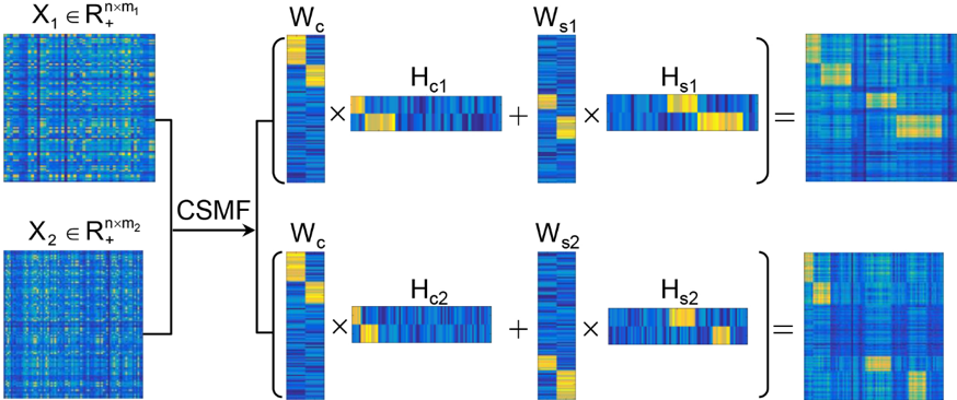 随着高通量测序技术(例如ChIP-seq,RNA-seq和single cell RNA-seq)的发展,逐渐产生并积累了大量的不同条件且相互关联(如不同癌症、不同细胞系、不同时刻)的基因组数据。这为通过大规模数据分析和数据比较,来揭示不同关联条件下存在的共性和特异性提供了机会。整合分析与差异分析是两个常用的数据分析的范式。然而,通常的整合方法忽略了差异的模式,而差异分析方法通常不能识别差异部分的组合模式,一些识别组合模式的方法则要求数据的维数是匹配的。为此,该研究提出了一个基于非负矩阵分解技术,同时识别共有和特异组合模式的强大模型CSMF(Common and Specific patterns via Matrix Factorization)。