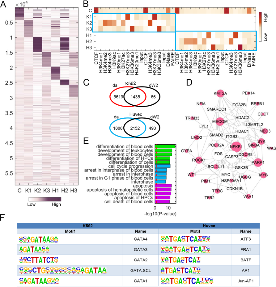 图(二)CSMF识别K562和Huvec细胞系中组蛋白修饰的组合模式。 该研究于当地时间6月8日在线发表在国际学术期刊《Nucleic Acids Research》上,题目为“Learning common and specific patterns from data of multiple interrelated biological scenarios with matrix factorization”。张世华课题组的博士生张丽华为该工作的第一作者。该工作受到中国科学院先导专项、国家自然科学基金、中国科学院前沿重点研究项目等的支持。 |