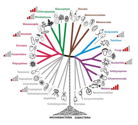 图1. 形态种在真核生物中的广泛分布(柱状图表示各真核生物类群中形态种报道数目,基于Web of Knowledge文献检索结果整理;图修改自Adl等,2012)。