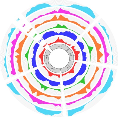 图2. 四膜虫形态种基因组演化特征(SSG: 大核中种特异基因、CSG: 大核中种间保守基因、LRR: 大核中富含亮氨酸重复序列基因、Ka/Ks值、TD:串联重复率、GE:纯培养条件下基因表达值在5条小核染色体上的分布)。