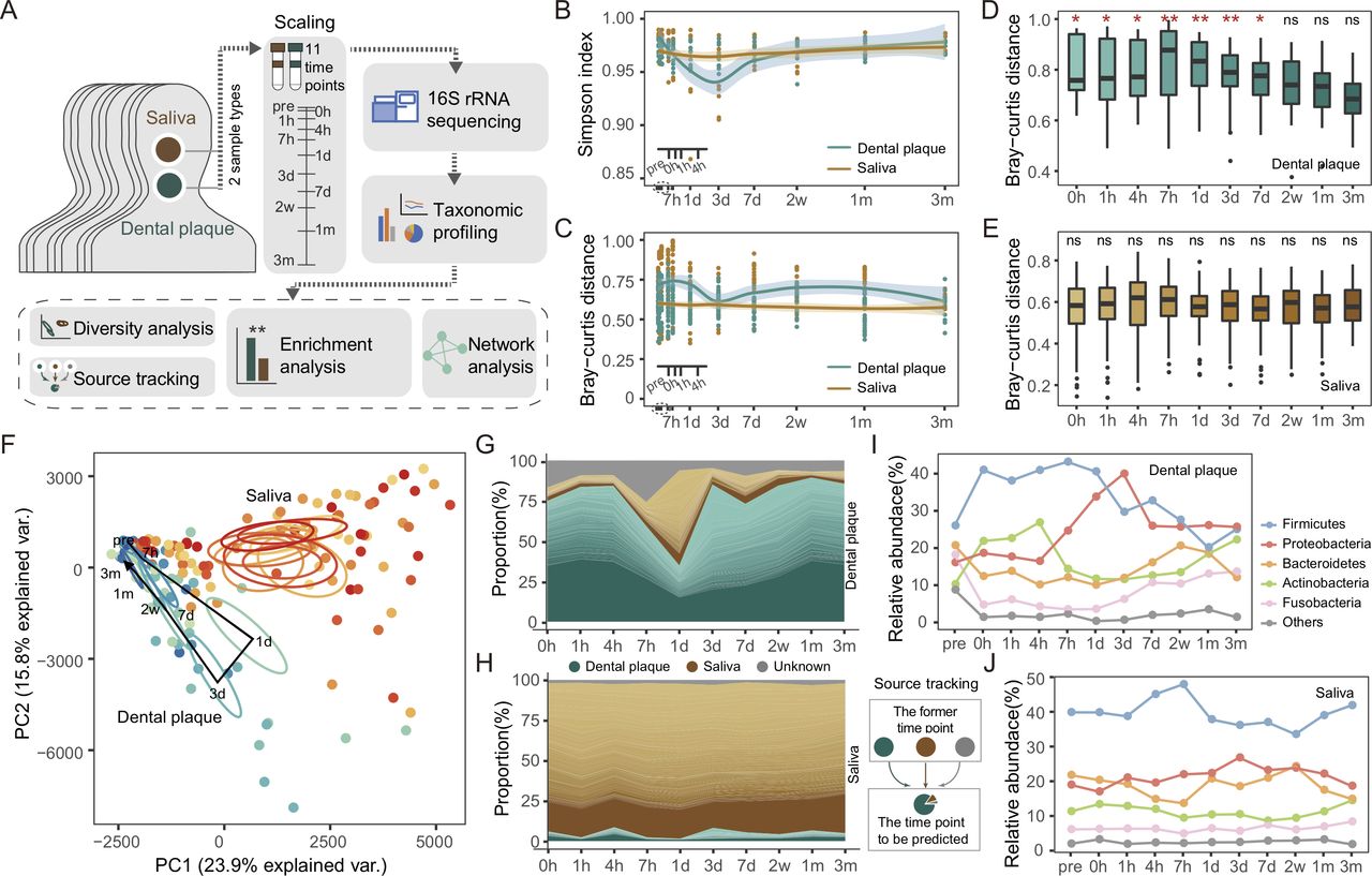 2019年6月21日,国际知名学术杂志《Gut》刊发表了来自中科院动物进化与遗传前沿交叉卓越创新中心/中国科学院北京生命科学研究院赵方庆团队题为“Tracing the accumulation of in vivo human oral microbiota elucidates microbial community dynamics at the gateway to the GI tract”的研究论文。这是该团队继2018年5月在此杂志上发表孕期健康塑造新生儿初始菌群的研究论文后,再次推出他们在口腔微生物膜形成研究方面的最新成果。该论文得到了杂志主编的高度评价,认为该工作精彩揭示出口腔菌群从破坏到重建的完整过程。 该研究立意于人们最近发现大多数口腔细菌能在肠道定植,像类风湿性关节炎、IBD和结直肠癌等患者肠道中富集的细菌很多来自口腔。并且,微生物由口腔沿着消化道异位定植不是偶发事件,而是频繁且连续的过程。这些发现强化了口腔与肠道之间的联系,也激发了关于疾病起源于口腔、肠道亦或两者皆有的讨论,提醒大家不能忽视口腔菌群、小生境及口腔健康。不仅如此,将口腔菌群用于消化道或其它疾病的辅助诊断也具有潜在的应用价值。作为口腔微生物两种基本的储存形式——流动态的唾液和附着态的牙菌斑,从时间梯度上探究它们的稳定性和动态变化,关乎到更好的理解口腔菌群,以及判断它们作为生物标记物检测疾病的可靠性。 洗牙是临床常见的牙菌斑清理手段,这为跟踪口腔生物膜附着情况和菌群重建过程提供了便利。赵方庆团队对洗牙前后三个月的11个连续时间点共169个唾液和牙菌斑微生物组数据进行深度挖掘分析,以研究受到外力扰动时,崩解的口腔微生物膜恢复到初始状态的时间,以及口腔菌群作为标志物是否具有足够的稳健性(图1)。