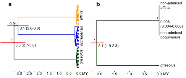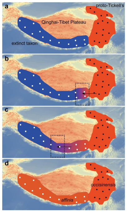 线粒体基因由于具有比核基因更快的突变率,使其能有效应用于近期分化物种的系统发育研究和估算物种分化时间。然而在某些特殊情况下,单个群体内或者两个近期分化的物种之间,会出现多个深度分化的线粒体支系,这种现象我们称为深度的线粒体分化(DMD,deep mitochondrial divergence),表示两个种群之间在核基因组不分化或者分化不明显的情况下具有非常深的线粒体分化,而不同的线粒体支系之间同时还伴随着显著的核基因流。我们以黄腹柳莺(Phylloscopus affinis)种组为研究对象,通过基因组序列和多个表型数据(鸣声、羽色和形态测量)的比较分析,发现分布于喜马拉雅地区的黄腹柳莺(P.affinis)和分布于青藏高原东部的华西柳莺(P.occisinensis)之间的核基因和表型均无显著分化,但其线粒体分歧时间达到了3个百万年(图1),是一种典型的DMD现象。另外,基于对种群动态、连锁不平衡和基因组分化高峰区的分析,本研究推测在青藏高原东部分布的祖先种群(proto-Tickell’s)向西扩张并替代了当时分布于该区域但目前已灭绝的另一物种(图2),而灭绝物种的线粒体以及少量核基因片段通过遗传渐渗传递到了该扩张种群,形成了目前的黄腹柳莺。而此灭绝的物种则被称为“幽灵种”,与幽灵种之间的基因渗透现象则被称为“幽灵渗透”。 随着基因测序技术的发展,近缘物种之间的基因渐渗现象在学界已经被广泛认同。比如,化石DNA证明了现代人与其近缘类群尼安德特人和丹尼索瓦人均存在不同程度的基因渐渗,虽然后两个人种已经灭绝,但其部分基因已经整合到部分现代人类的基因库中,并且发挥着重要的作用。物种灭绝在自然界是很普遍的,我们的研究推测:和已灭绝物种之间发生“幽灵渐渗”的现象可能是自然界很常见但目前却被广泛忽略的一种现象。 该项工作以“‘Ghost introgression’ as a cause of deep mitochondrial divergence in a bird species complex”为题于2019年7月31日在线发表于国际权威学术期刊Molecular Biology and Evolution。动物进化与前沿交叉卓越创新中心成员/中国科学院动物研究所雷富民研究员和贾陈喜副研究员为论文的联合通讯作者;新加坡国立大学的Frank Rheindt和瑞典乌普萨拉大学的Per Alstr?m教授共同参与本项研究;中国科学院动物研究所博士后张德志为论文的第一作者。该项研究得到国家自然科学基金重点项目(316300690)、中国科学院战略先导项目(XDB13020300)等项目的资助。(论文链接https://academic.oup.com/mbe/advance-article/doi/10.1093/molbev/msz170/5541797)